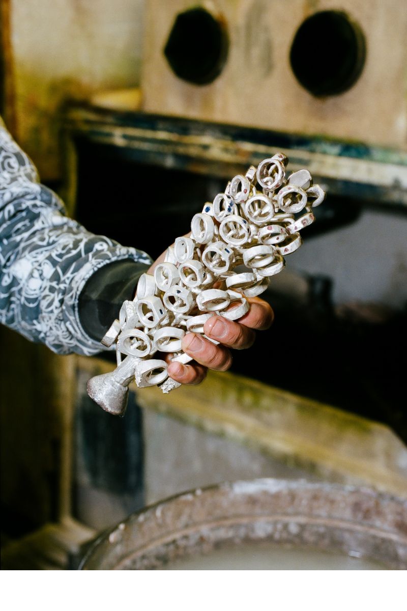 Toby Vernon first started experimenting with jewellery making during the first lockdown whilst in his home town Lewes in East Sussex. Learning about the ancient lost wax technique he quickly became obsessed with the raw and organic forms that could be carved from wax and turned into precious metal. Celebrating imperfections left by his own hands , he decided to leave pieces unpolished and raw. Showing evidence of the human hand overall the jewellers surface. Before this, Toby studied Fashion Design at Westminster University, developing a unique set of design references that now inform his work at The Ouze. His unconventional background in fashion design has allowed him to experiment with alternative jewellery-making processes and to develop The Ouze's distinctive signature style. During his final year of university, whilst making clothes the jewellery continued and became embedded in his work. Brooches, buttons and buckles in silver complimented each garment. After graduating, Toby decided to move to Brighton so he could focus on The Ouze and hasn't looked back since.
